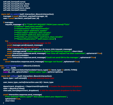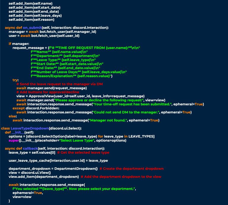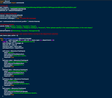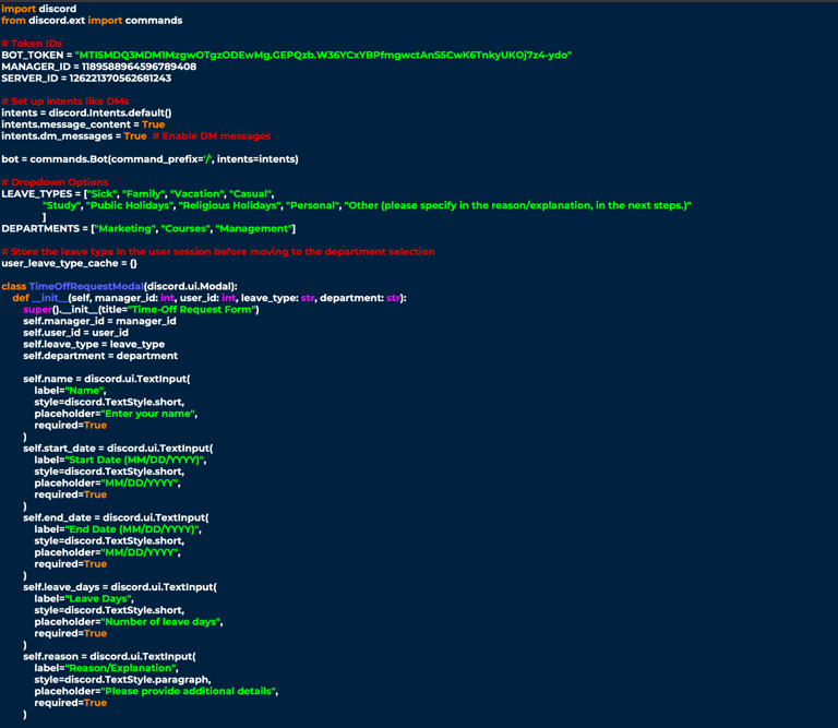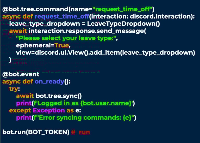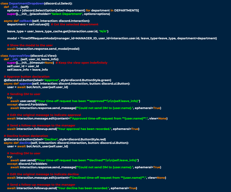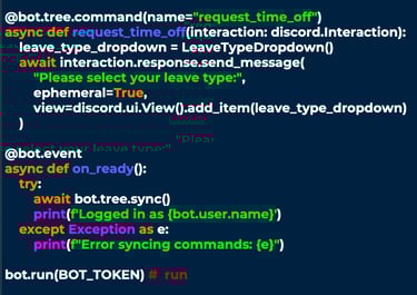 Another major project I worked on was building a Discord bot designed to handle time-off requests in a server. The idea was to create a tool that automated a repetitive task: allowing members to submit requests for time off and having the system log, approve, or notify managers without needing manual tracking.